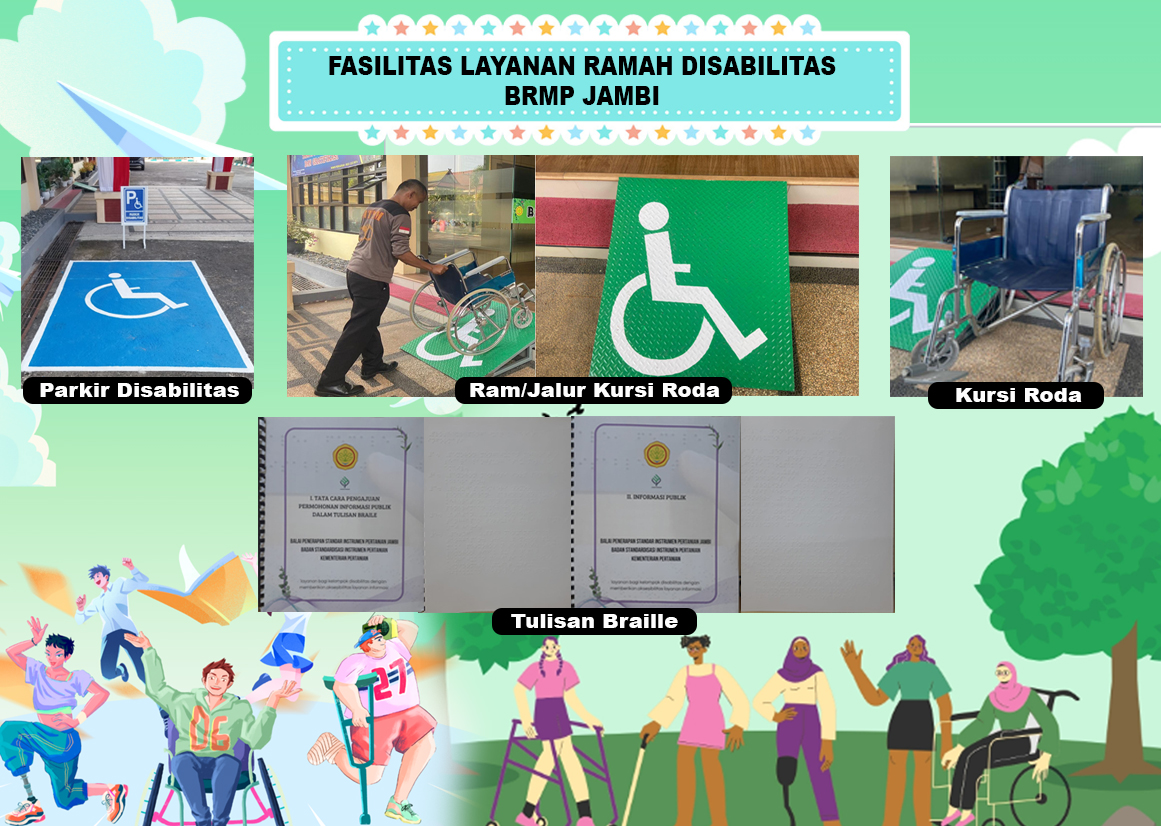 Sebagai instansi yang berkomitmen pada pelayanan inklusif, Balai Penerapan Modernisasi Pertanian (BRMP) Jambi menyediakan sarana dan prasarana ramah disabilitas. Fasilitas ini dirancang untuk memberikan kenyamanan, kemudahan akses, serta kemandirian bagi penyandang disabilitas dalam memanfaatkan layanan dan mengikuti berbagai kegiatan di lingkungan balai.